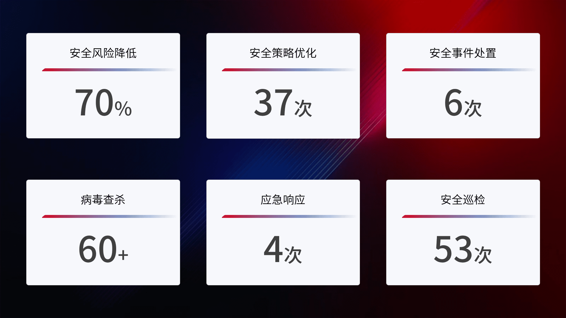 提供全面的安全事件报告体系,,包括处置报告、、、、周报、、、、季度和年度总结,,,结合持续监控,,,,帮助客户深入了解网络安全状况。。。
